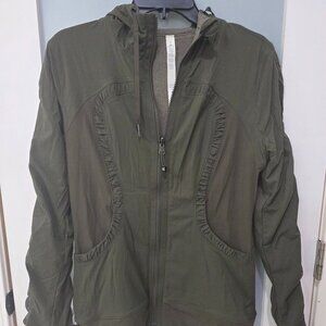Lululemon green jacket, Lululemon ruched arm jacket, Lululemon size 8 zip up, Lululemon hunter green hoodie, Lululemon women’s activewear jacket, Lululemon fitted jacket, Lululemon workout jacket, Lululemon yoga jacket, Lululemon thumbhole jacket, Lululemon ruched sleeve coat