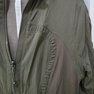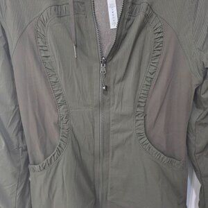 🌿 Stylish performance wear! This Lululemon women’s full-zip jacket in hunter green is perfect for active days or casual outings. Designed with unique ruched detailing on the arms, a fitted silhouette, and functional thumbholes, it combines fashion with function.