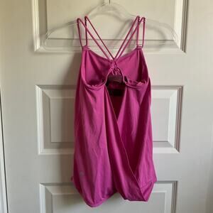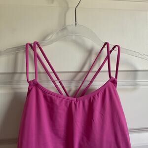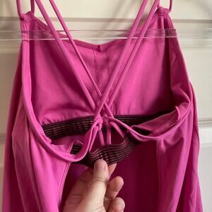 Lululemon women’s make a move pink paradise 2 in one tank top. Criss cross back. This does not have padding, but there are openings to add padding.