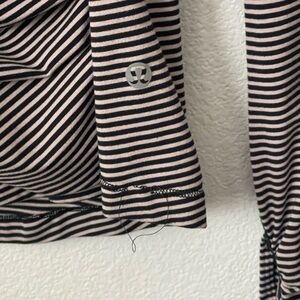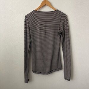 The Lululemon Women's Medium The Sunset Salutation Long Sleeve Wrap Top in Black and Gray is a stylish and functional activewear top perfect for various occasions including gym workouts and casual wear. This pullover top features a striped pattern, long sleeves with thumb holes, and a v-neckline for added comfort and style. Made from stretchy fabric with a medium wash, it offers a slim fit and is branded with the iconic Lululemon logo. Ideal for all seasons, this top is a versatile addition to any woman's wardrobe, combining athleisure and sporty themes with a touch of modern style.