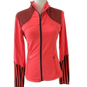 Stylish women's jacket featuring a vibrant coral color with super dark, navy striped accents. Perfect for adding a pop of color to your wardrobe. Mesh pockets with a zipper closure. This jacket is in great shape. Size 6.