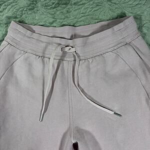 Light pink Lululemon scuba joggers size 8. Soft and cozy. Cotton polyester blend. Drawstring elastic waist, pockets. Faint white discoloration on front of left leg.