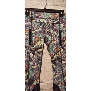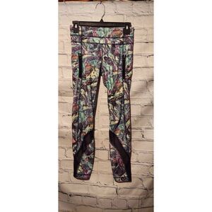 Lululemon Womens Size 4 Small Leggings Green Yellow Floral Zippered Front Pockets Mesh