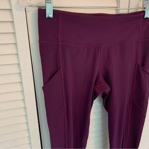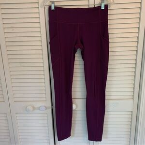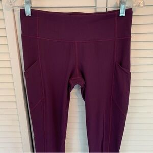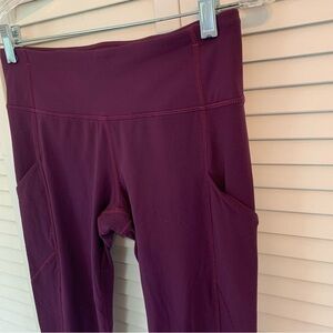 Lululemon leggings, Lululemon size 6, high rise leggings, 28 inch inseam, purple leggings, plum leggings, yoga pants, workout leggings, women’s athletic wear, side pockets, zip pocket, Lululemon preowned, Lululemon, gym leggings, running pants