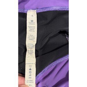 The product is a pair of Lululemon Women's Size 6 Run Zipper Pocket Reflective Crop Pants Capri in purple. These athletic leggings feature a solid pattern with a pull-on closure, perfect for both activewear and casual occasions. Made of nylon blended fabric, these cropped pants have a 23-inch inseam and a skinny leg style. They are designed for various activities such as gym training, running, yoga, and more. The reflective features enhance visibility during low-light conditions, making them ideal for summer, fall, and spring seasons. Easy to care for with machine washable instructions, these pants offer comfort and compression for active women looking for style and performance in their wardrobe.