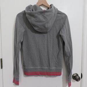 Lululemon Flashback Hoodie in gray and pink. Full front zippered jacket with hoodie. Kangaroo pockets and thumbholes. Hoodie ahs a lululemon embroidered logo on arm. Pink stitching, rare jacket. Contrast stitching.