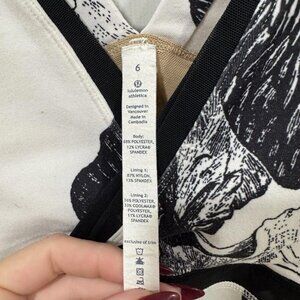 This Lululemon tank top is a stylish and versatile piece perfect for various occasions like travel, casual outings, or activewear. The sleeveless pullover design features a V-neckline and wide straps for a comfortable fit. Made from a mesh fabric with a floral pattern in white and black, this tank is lined and suitable for all seasons. It is a size 6 and part of the Lululemon product line, known for its athletic fit and performance features, making it ideal for activities like yoga, running, or gym training. Perfect for those looking for a colorful and sporty addition to their wardrobe.