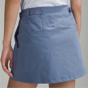 This lululemon stretchy wrap skirt has an overlapping front panel and built-in shorts. Designed for golf. Mid-rise. The liner length for all sizes is 4". It features a liner with a drop-in pocket, front pockets with interior card sleeves, and back pockets to stow scorecards. The belt at the waist lets you customize your fit and stash your glove. Fabric: Luxtreme