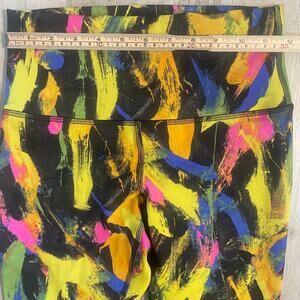 Features vibrant multicolor abstract print with yellow, pink, blue, orange, and black tones