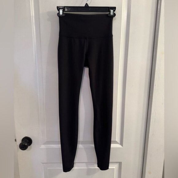 Excellent condition size 4 28” high rise wunder train leggings. No stains, holes, flaws, or signs of wear. These are the newer version w logo on calf, couldn’t find stock photo in black. Riptag removed but size dot intact.