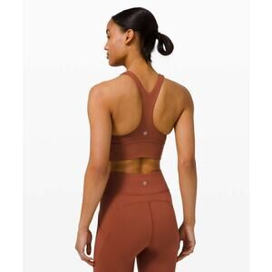 Dial in to your training with Lululemon's Wunder Train Long-Line Racerback Bra. Powered by highly breathable Everlux, our fastest drying fabric, this bra combines support and coverage so you can breeze through hot, sweaty workouts. Everlux fabric is engineered to keep you feeling cool and dry in hot, sweaty indoor environments. Best fits C/D cups. Brand new with tags. Size 6. Retailed for $68. Color is "Dark Terracotta".