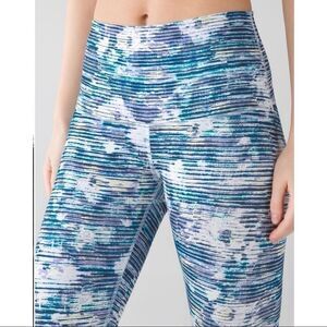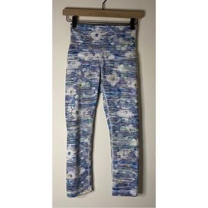 Wunder Under crop leggings from Lululemon. Pattern: Blurry Belle Multi. Size 4. Approximate flat lay measurements- Waist: 11.5” across. Rise: 9.5”. Inseam: 23”. Gently preowned condition with no tears, pilling or stains.