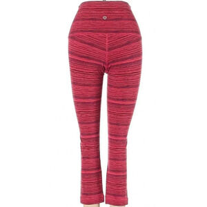 These are Wunder Under Crops by Lululemon in Cyber Boom Juice / Alarming stripe. Crops are high waisted and made of Full-on Luon. Color is a coral pink with interwoven stripes in dark indigo and dark gray.