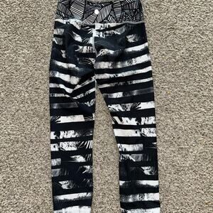 These leggings feature a bold black and white striped pattern with a unique distressed effect, offering a striking and artistic look.