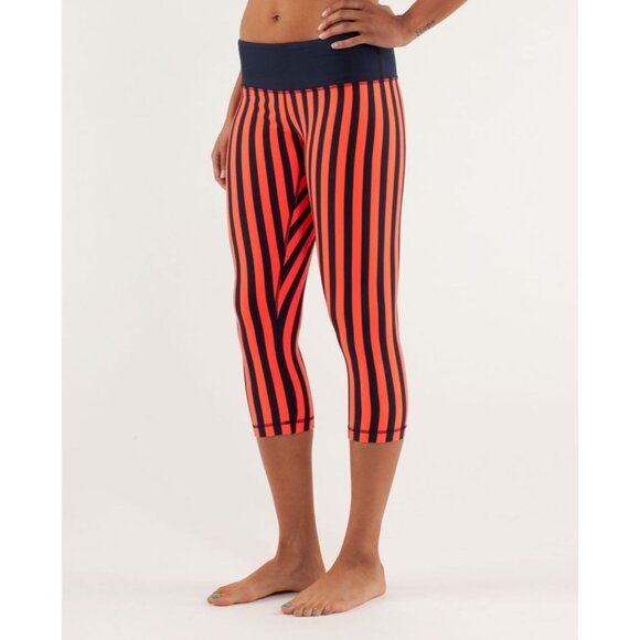 Lululemon Wunder Under Crop Leggings, Navy Blue with Neon Orange Stripe, Size 8