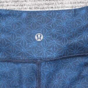 Classic Lululemon Wunder Under crops in a blue geometric starburst print with a wide, supportive waistband. Soft, stretchy Luon-feel fabric—great for yoga or everyday wear. Clean overall with light normal wear; see photos for close-ups. Color may vary slightly from photos due to lighting and monitor settings.
