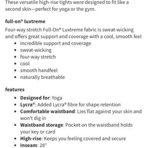 About Item: These versatile high-rise tights were designed to fit like a second skin-perfect for yoga or the gym. full-on® luxtreme. Four-way stretch Full-On® Luxtreme fabric is sweat-wicking and offers great support and coverage with a cool, smooth feel