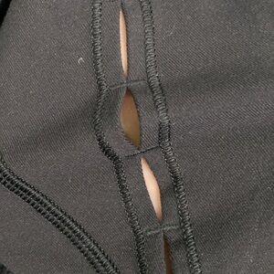 Luon fabric: 4 way stretch, sweat wicking, butter soft. Curvy seam line with tiny peak of skin showing through. Slip pocket inside waistband.