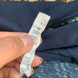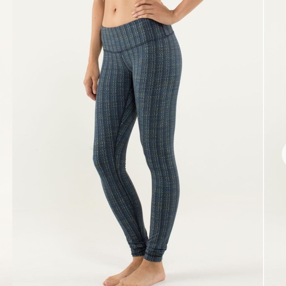 Lululemon Wunder Under tights in Ziggy Wee August Inkwell color. It’s a warm and sweat wicking jacquard version of their Luon fabric, with a small front pocket and a 31” inseam.