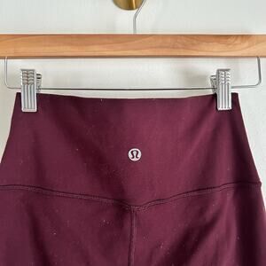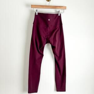 Details: Lululemon Wunder Under Pant (Hi-Rise) *Full-On Luon - Size: 4- Color: Wine Berry Red - Material: Full On Luon - Features: High rise waist, pull on, stretch, wide waistband, elastic waist, logo, comfort, breathable, casual, activewear.