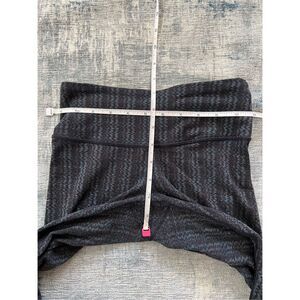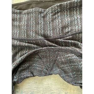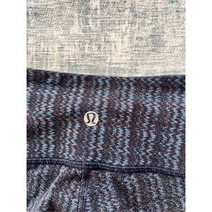 Black and blue Lululemon Wunder Under leggings with a zig zag pattern throughout. Pocket inside waistband. Approx 30.5 inch inseam. Good condition, light pilling and wear. Please note: sizing is based on measurements. To ensure a proper fit, please examine measurements shown in photos closely.