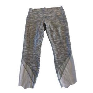 In used condition. A few small stains (please see all photos). No size tag, but fits like a women's size Large. Please see all approximate measurements. 24" inseam. Gray and white heathered color. Can be worn high-waisted or can be worn rolled down. Some pilling in between the thighs.