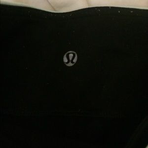 Cropped lululemon wunder under cropped pants with a teal and grey band. They are pilling a little bit, but it's not too noticeable