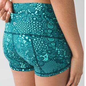 Gorgeous and rare Lululemon Wunder Train Shorts in the 2’” inseam, featuring the stunning **Pretty Lace** print in Bali Breeze/Alberta Lake. These eye-catching shorts are perfect for intense workouts or athleisure looks, combining function and fashion effortlessly.