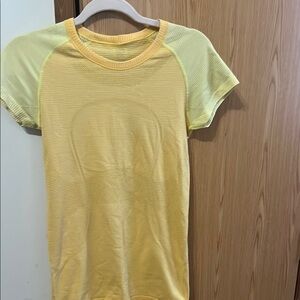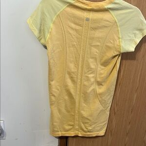 Lululemon athletic top in a vibrant yellow. Features a textured design and comfortable fit.