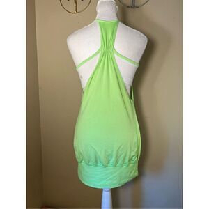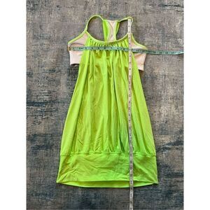 The thin straps and racerback cut allow you to twist with ease. The wide band around the hips keeps the tank in place. Built in shelf bra with openings for optional bust padding (not included). Neon bright yellow green and white. Gently used condition. Faint mark on the back. See last photo for reference.