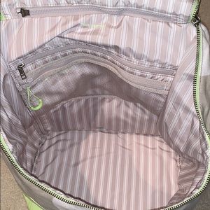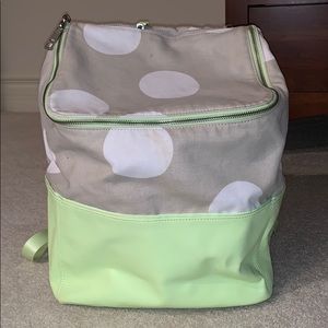Tan Lululemon backpack with white polka dots and green accents. There are pockets on either side and multiple on the inside. This is a great weekender bag as it can fit a lot of clothes and anything else you could need.