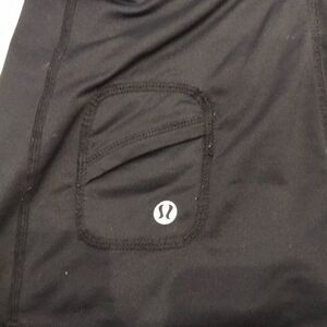 Lululemon black top with gray stripes with ruched detailing on back. Tag has been cut out but size 6 shows in the pocket. Gently used.