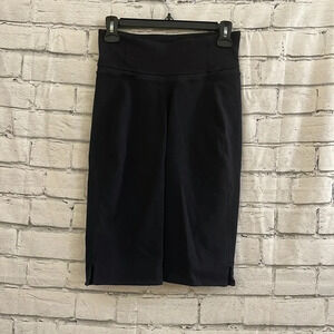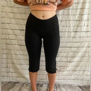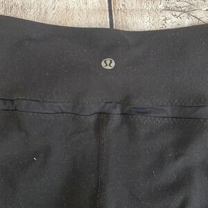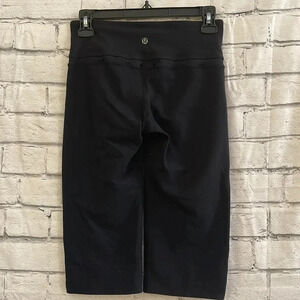 Women’s. Lululemon. Black leggings. Cropped- just past the knee. Used condition. No stains/tears. Typical piling/fading from washing/wearing. Size 6.