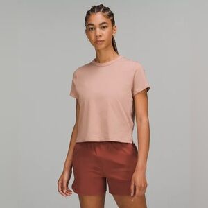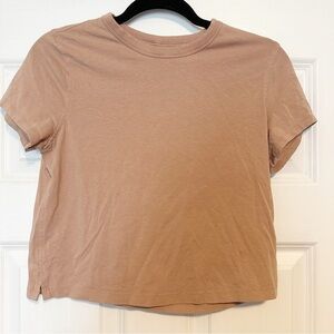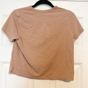 Lululemon classic fit cotton blend tee. No size tag but fits like a size 6 or a small, see measurements for accurate fit! Great shape, mauve color or “pink clay” top that’s slightly cropped, perfect for lounging, working out or running errands! Sweat wicking, four way stretch, quick drying. Cotton-lyocell fabric is blended with linen for natural softness