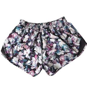 Lululemon feminine floral patterned lined travk shorts with open inside back pocket and front side zippered pocket. Wide elastic waistband. Shortie shorts.