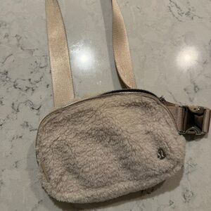 About 8 inches by 5 inches bag with zipper , crossbody strap and same strap to use around waist like a fanny pack