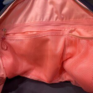 Cute dark purple athletic tote with two large compartments - one for all your workout gear and including several interior pockets for toiletries; one for your laptop! Minor staining on the exterior. Long handles and an external phone pocket. Perfect for going to the gym after work!