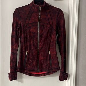 This sleek jacket from Lululemon Athletica features a form-fitting design with a high collar and long sleeves with thumb holes, perfect for athletic or casual wear. Crafted from a stretchy performance fabric, it offers a flattering fit with contoured panels and a hip-length cut