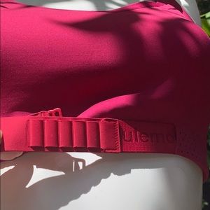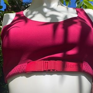 Lululemon high impact bra in magenta and red. Cross-cross back and adjustable strap across the front for extra support