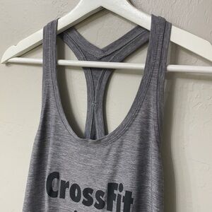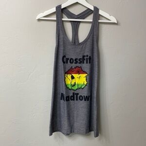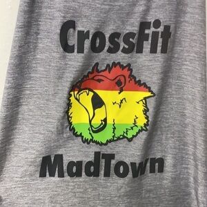 Lululemon gray CrossFit mad town graphic tank top.No material tag or size.I think it is a medium.Good condition.Length is 27.5” and chest is 14”. Soft material.