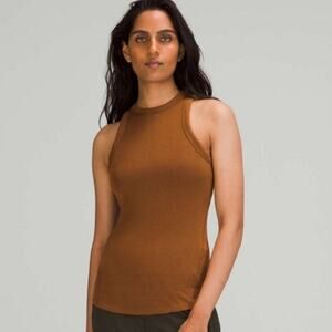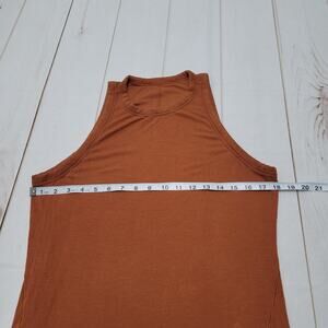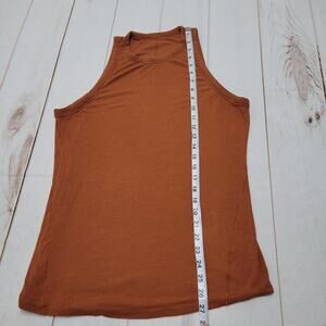 Nice Luluelmon high neck tank top! Rust orange color in a ribbed texture with a longer length. Size 14 (No size tag but it was a personal item I purchased with rip tags so I'm certain of the size). Item has allover wash wear and a small faded spot.