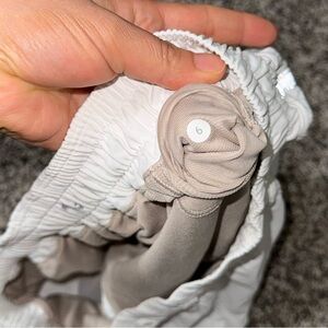 Look at all the photos. It has a very light yellow stain, it's not very noticeable and I'm sure it will come out with a stain remover.