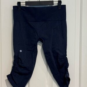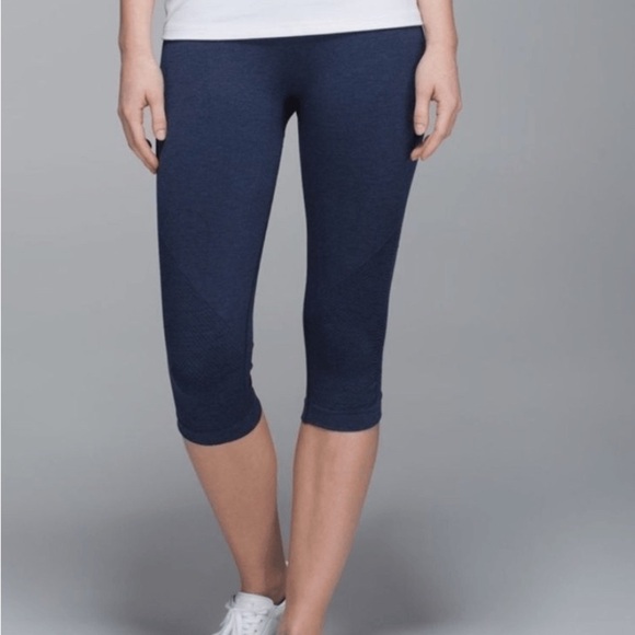Lululemon In the Flow Crop II in Heathered Navy Blue Features: lightweight, breathable Seamless fabric makes these crops a workout staple, moisture-wicking technology pulls sweat away from your skin, wide, smooth waistband covers without digging in Rip tag removed. Size on inner hem. Size 8. Small hole on side
