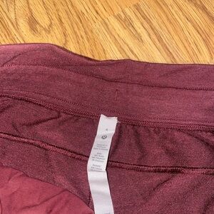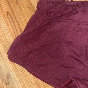 High rise inner glow shorts in heathered dark red. Super soft comfy material, size 4. Worn and washed 2-3x, no flaws. Has drawstring waistband and pockets