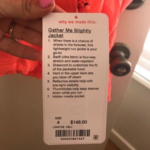 Bright orange lululemon jacket, brand new with tags. Didn't ever wear it because I thought it was to bright once I got it home.