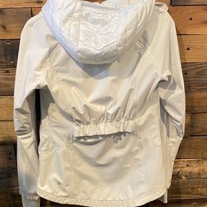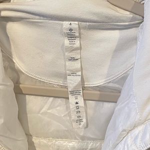 White, 2-layer jacket from Lululemon. Inner layer is cropped and down filled. There is a pocket in that layer (see picture). Outer layer is a stretchy material. There is a small mark on the left shoulder (see picture)