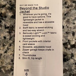 This is the Lululemon beyond the studio jacket. Perfect for a run or just going out for errands. Size 6, in excellent condition! Worn only twice by me. Just never reached for it. No stains, from a smoke free home.
