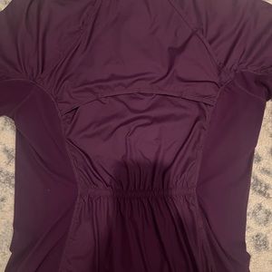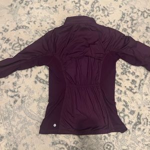 Gently worn Lululemon jacket. Made of polyester, nylon and elastase. Has thumb holes, zippered pockets, a hood that can be rolled into the collar, vent in the back, elastic at the waist in the back providing a good amount of stretch. Deep purple in color
