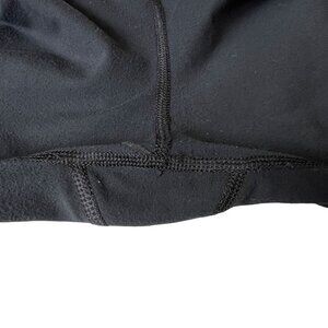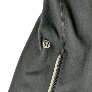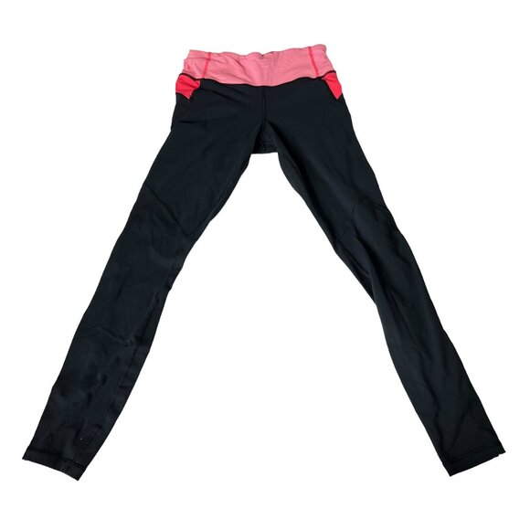 Lululemon leggings, black with pink striped waistband, zippered rear pocket, reflective strips on the legs, size 6, waist flat: 13", rise: 9", inseam: 30", preowned and shows wear on the fabric - see photos