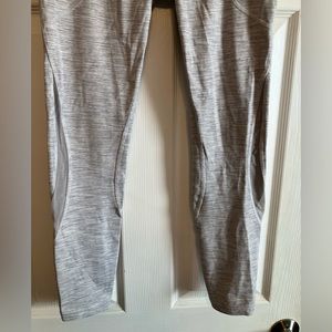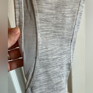 Lululemon light gray and white mini striped high waist leggings with mesh cut outs on outer calves! Great functional zipper front pockets, 2 hidden waistband pockets with size number inside, logo on leg nice condition, no stains or flaws! Nice versatile and neutral leggings in Lululemon size 6. Ties inside waist and is knotted. From nonsmoking home. Great for athletic activities! Rise measures 11” unstretched, inseam 26.5” unstretched. Waist stretches from 12.5” out to about 15”. Stitchings all look good too! Look really nice on!